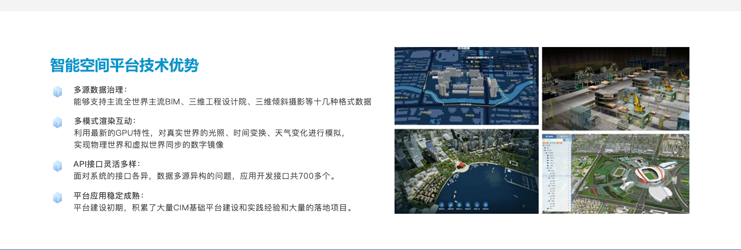 智能空间技术根据云平台建设标准进行建设,利用多种工具和技术构建数据库。PaaS层是CIM的核心引擎,CIM基 础平台在大规模三维数据承载技术、 实时渲染技术、 仿真融合技术、共享交换技术等领域有丰富的经验。