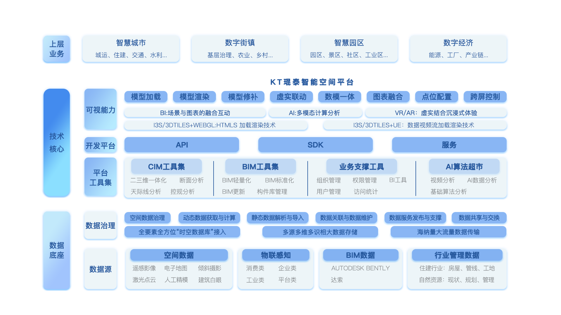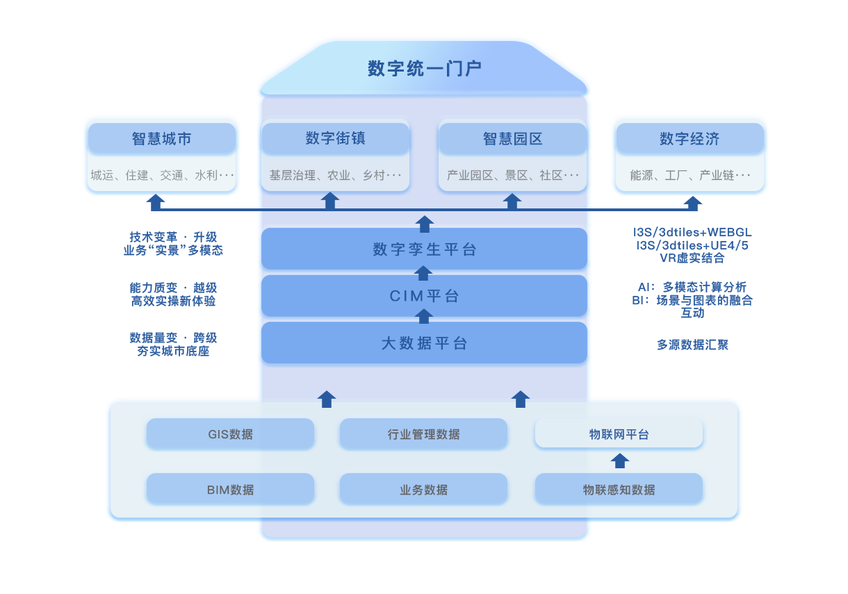 在多源异构数据融合、轻量化、大体量城市数据承载以及游戏级画面展示等方面形成了核心优势。在应用上支撑综合管理平台,智慧城市,智能能源智慧工业等的相关应用场景。平台总体架构如下图所示:
